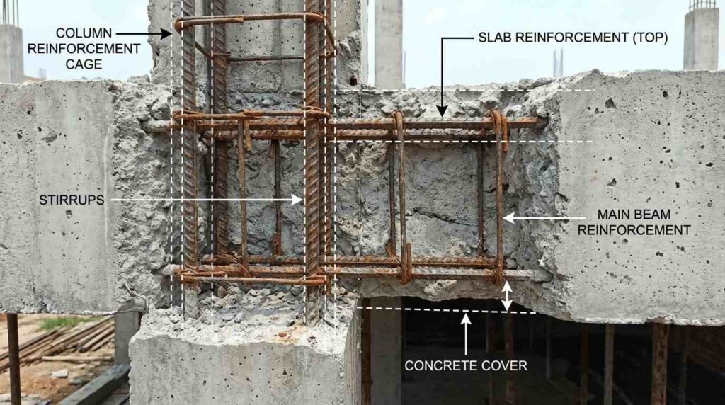 Beam construction ranges ₹250-₹350 per square foot of building area, with deeper beams for longer spans requiring proportionally more materials. Main beams supporting multiple floors use M25 or M30 concrete with dense reinforcement cages, while secondary beams can often use M20 grade. Concealed beams integrated within slab depth reduce ceiling heights but increase material consumption and construction complexity.
